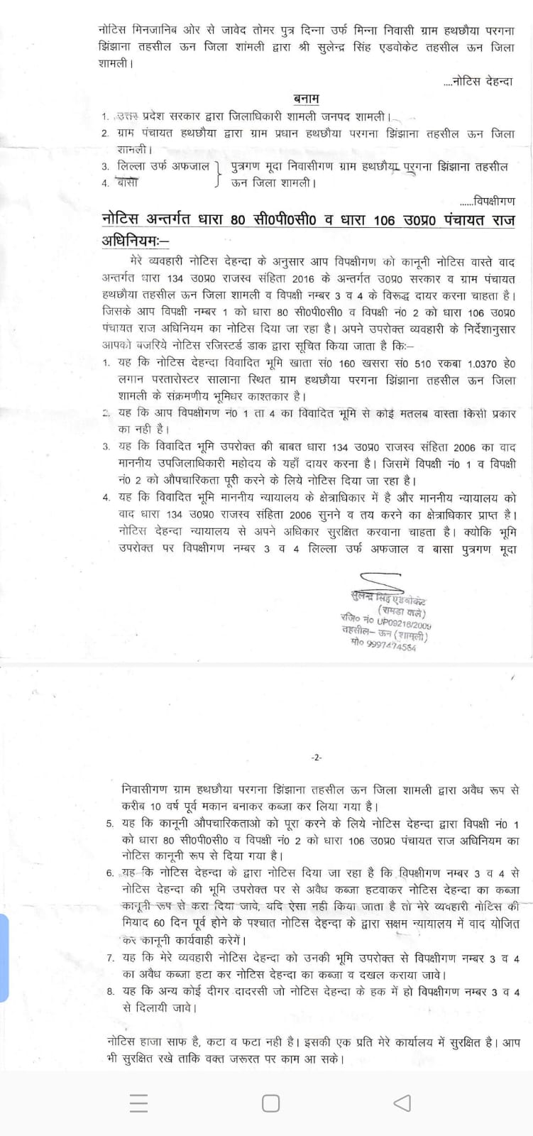 21 मार्च 2025 को जावेद तोमर ने अपने वकील के माध्यम से एक नोटिस भेजा जिसमें कहा गया कि शिकायतकर्ताओं का कब्जा अवैध है और हाल ही में हुआ है, जबकि सच्चाई यह है कि मकान 40 साल पहले बने थे। शिकायत में यह भी कहा गया कि नोटिस में जानबूझकर कब्जे को केवल 10 साल पुराना बताया गया ताकि कानूनी कार्यवाही का रास्ता आसान हो जाए।